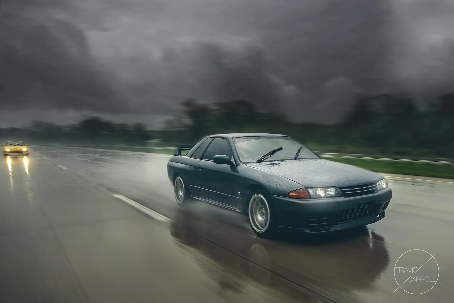 After exchanging a shitload of different ideas back and fourth off of some awesome people, we eventually decided that we would go down to the road and try to do something a little different. I knew that I really wanted to get a rolling shot of a car in the pouring rain with enough standing water on the roads to create the misted effect. I also knew that I wanted to capture the rain and have it be apart of the image. I jumped in the back of my buddies wagon, tethered to another buddy in the front seat so he could check focus and exposure, and we were off.